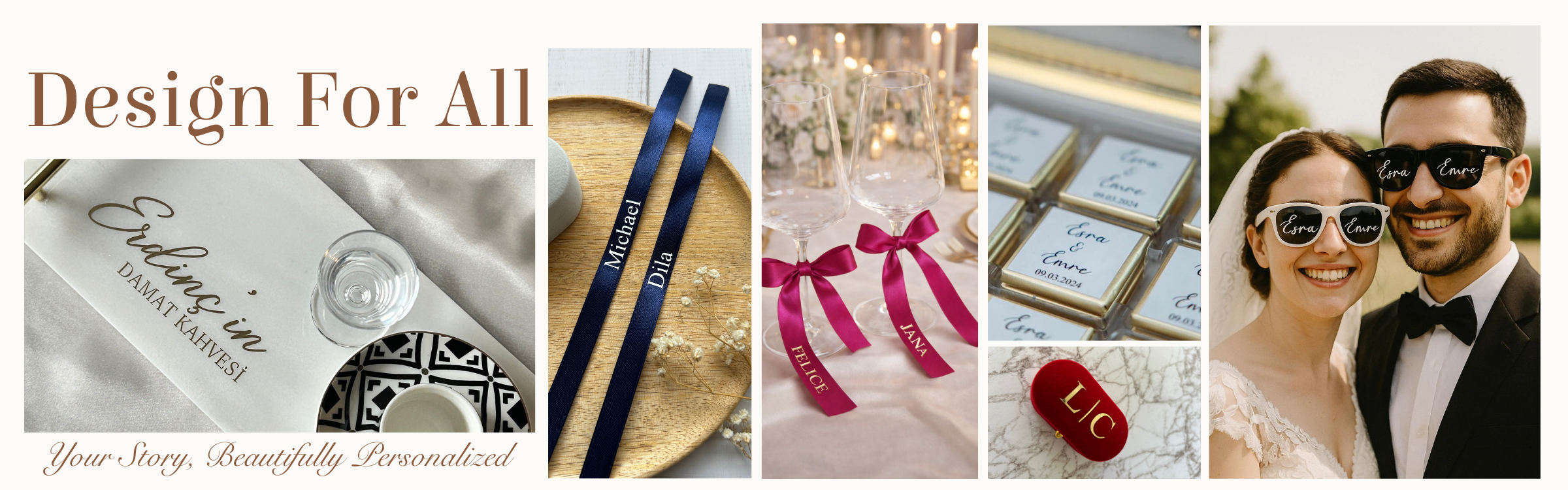 Welcome to Design For All, your destination for custom-made wedding decorations, personalized baby announcements, and unique gift ribbons in the Netherlands. Each product is handcrafted with care and personalized to make your special moments unforgettable. From elegant satin wine glass ribbons to custom window stickers, we create beautiful keepsakes that celebrate life's most precious events.